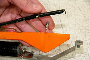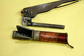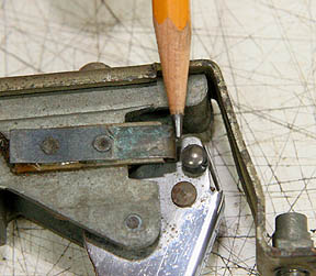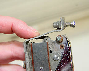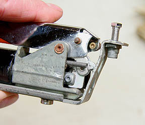 When arm is fully raised, this brass rivet comes in contact with a brass tab to provide power for the bulb. This rivet usually gets tarnished and needs cleaning. |