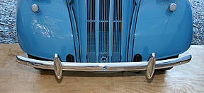 We can breakdown these bumpers into several categories: (Anglia, Popular, Thames), and Prefect. Next, you can divide them into early and late: 1939-1948 for early, and 1949-1953 as well as the 1954-1959 for the Popular, for the late. The basic difference between early and late is the shape of the ends: early bumpers come more to a point, while the later ones are more blunt shaped. Front bumpers are basically the same, as they all should have a centered flared hole (1-1/8-inch I.D.) for a hand-starting crank. Rear Anglia/Popular/Prefect bumpers come with only two mounting holes, while a Prefect rear has four- to-six holes. Rear bumpers can be interchanged if you must; you just end up with extra holes to deal with. The Prefect uses a "U shaped mounting bracket with two mounting holes per side, while the Anglia, Popular use a "C shaped bracket with only one mounting hole.