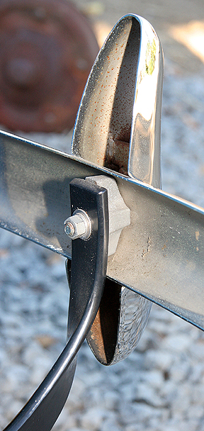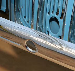 One last item about the front bumpers; in most cases, you will find two small stamped holes to the right and left side of the center hole. These smaller holes are used to mount the front license plate brackets. These two holes should be on the lower side of the bumper, so the license plate hangs down (and not up). Also, on some early front bumpers you will find an additional metal backing plate behind the center crank hole. These were held in place with two carriage bolts. No telling why some came with them, but most did not. I assume Ford used several different sources for these bumpers. I have seen some Anglia builders use a bumper from a Volkswagen Bug, which is about the right length, but it has way too much bow in it for my taste. And I have also seen a number of people use a MG bumper which is close in looks, but it does not have enough bow to match the shape of these cars.