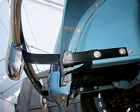 Front iron brackets bolted to the main frame rail and pass through the fenders before bending outward towards the bumper ends. |