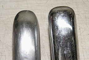 An "early" bumper end on the left, and a "late" bumper end on the right. Notice the shape of the ends, as the early blade has a more pointed end shape. |