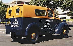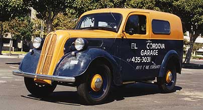 After discovering this 1953 Thames panel on Coronado Island, we towed it home and began cleaning up the chassis and engine compartment. With 46,000 miles since new, and being owned by a garage, the mechanical end of this Thames was in really nice shape. The engine, although tired, was still standard bore, and standard on the crank. We surfaced the head, added new piston rings, a new stainless steel exhaust, wiring harness, and rebuilt the fuel pump, it was back on the road. Our idea was not to fully restore this Thames but rather, to bring it back to the way it looked throughout most of its life. The photo above was taken this past spring, after we added the correct front bumper, remove the bogus rear bumper, redid the rear apron, painted the wheels and tires, and generally, detailed the snot out of it. Head and park lights are now correct, as are the side mirrors and rear license plate light assembly. Paint job and lettering dates back to the late fifties. All of the address, phone and names shown on the body are still correct and working! |