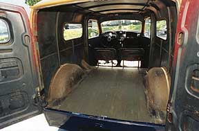 ABOVE, it's too bad that someone cut-out the side windows, but it does make driving around town easier. The rear doors are steel, and rear apron is now correct, with no bumper. BELOW, rear wood has been replaced only down the center, as the main framing was in good shape. We used cherry wood, and stained it to match the rest of the wood (dark green). Dark green paint on rear doors is the original factory color for most Thames panels. As you can see, at one time, this truck was red and black. |