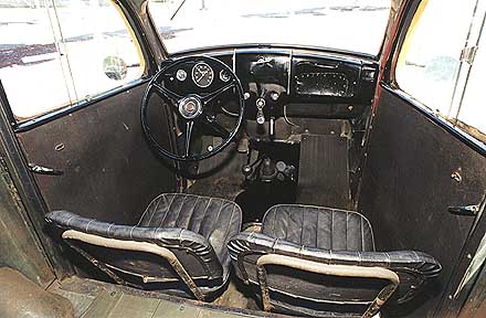 | ABOVE, interior was redone somewhat, by repainting the dash, steering wheel and window frames gloss black. Gauges are NOS, pedal pads are fresh, floor mats are new, seats are original upholstery. Front windshield frame was repainted satin black and a new front seal was installed. Door sliding windows are now complete with locks and handles. Thames has been driven about 500 miles since being first found, in a garage on Coronado Island. It is now fully licensed, insured, (everything works!) and back on the road. |