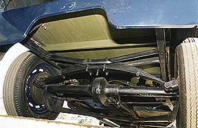 | BELOW, from underneath you can see the new wood flooring in place. The rear end and chassis was cleaned of grease and dirt and repainted black. Tires are new 5.25x16-inch Firestone bias-ply tires. Brakes are cable, rear end ratio is a wild 5.50:1! |