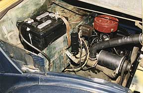 | BELOW, the original matching 1172cc/30hp engine was given a clean-up, new cloth wiring harness, new hoses, new Model A battery (positive ground), correct brass ground strap, wire hose clamps, and oil bath air cleaner (since painted black). Generator is a two-brush system matched with the correct voltage regulator. |