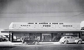 John W. Andrews & Sons Ltd., back in 1948. A fresh British-built Prefect sits out front ready to roll. |