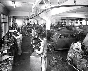 Body shop action shows a crashed Ford Prefect, and a Ford Anglia on the far ight. Lots of gas welding going on. |