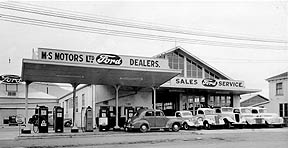 N-S Motoros Limited, shows full repair shop, petrol station, and their entire line up of shop trucks and vans. Actual dealership appears to be in the rear (see large Ford oval sign on the far left). |