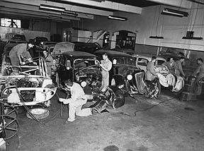 John Andrew Symond's repair shop back in 1954. Here you can spot a valve job going on, as well as several major engine rebuilds. |