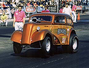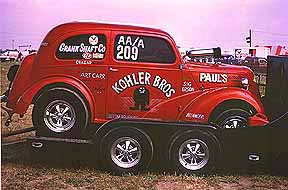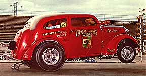 For the next four years, the number of Anglia gassers gradually increased although the supercharged divisons were dominated by the Willys and Austin - both of which had a longer wheelbase. Only a few racer took a close enough look at the Prefect and realized that its 94-inch wheelbase would be legal for this class. One such car was the "Hurst's Gasser Passer," built and driven by "Ohio" George Montgomery. The car was successfully campigned prior to his moving to a '33 Willys powered by a 427 SOHC Ford engine.