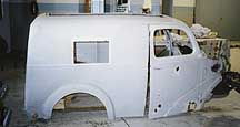 With body removed from chassis (BELOW), Steve primed it for the first time. Notice the non-factory side window. Holes in passenger door for space tire, have been welded-close.